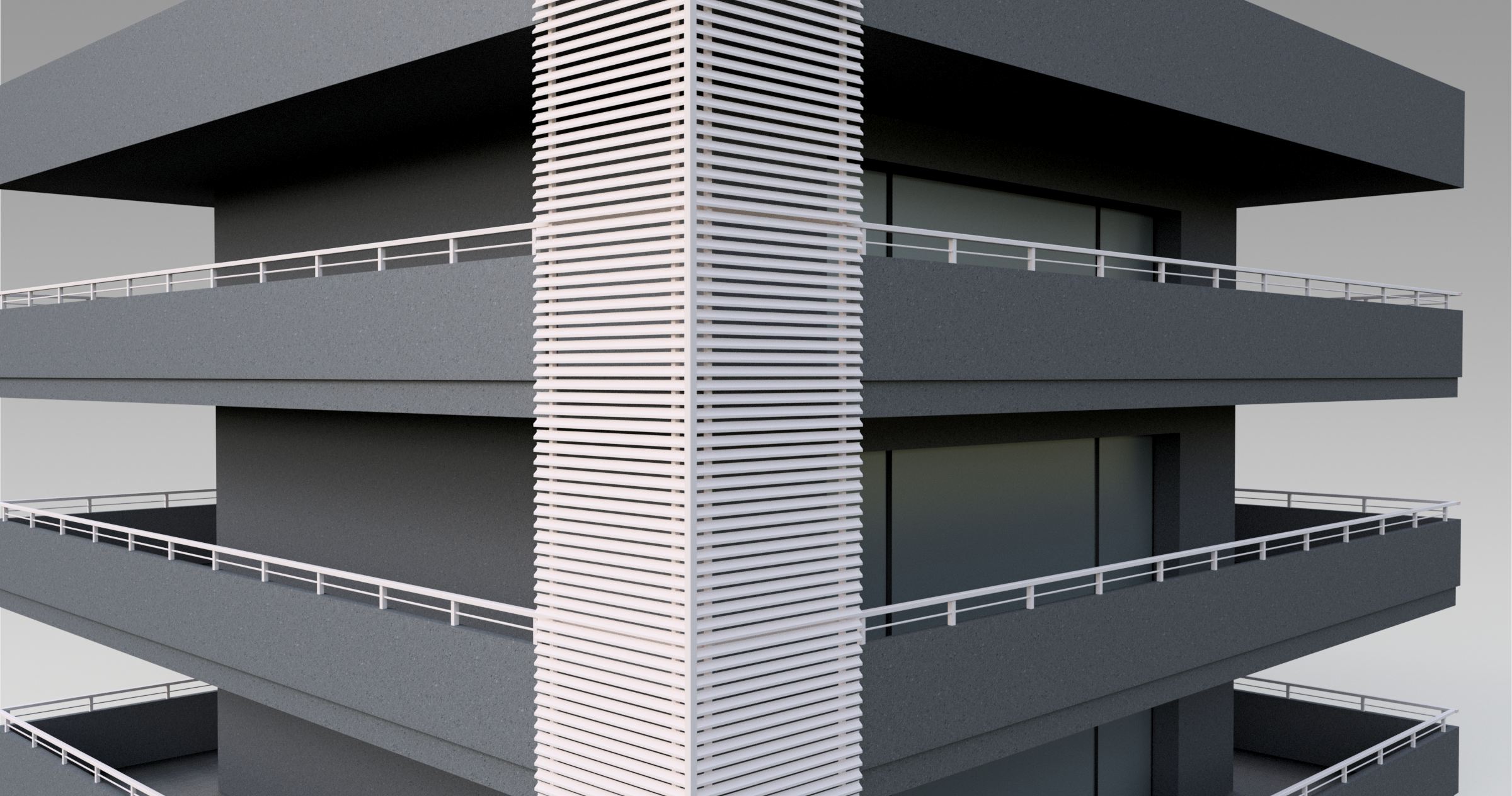 Pannello di completamento costituito da profilati lamellari in alluminio, sez. a Z, assemblati con tubolare in allumino estruso e ricoperti da distanziatori in alluminio verniciati RAL.