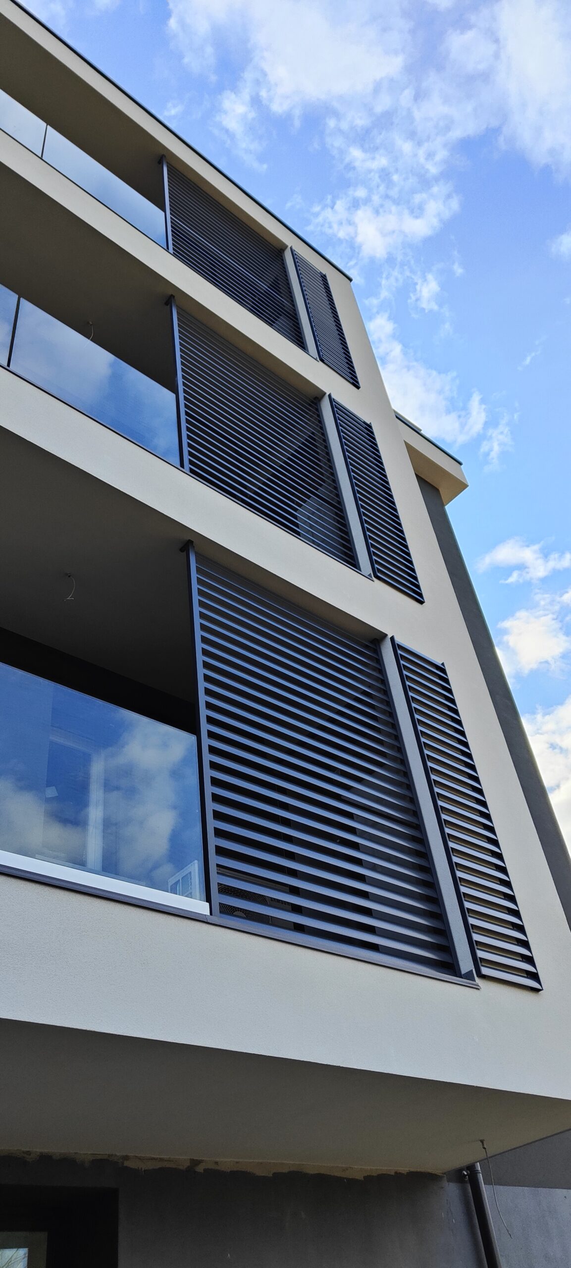 Frangisole modello ALL FIX 20, a schermo fisso, costituito da traversi o montanti in tubolare di alluminio verniciati RAL.