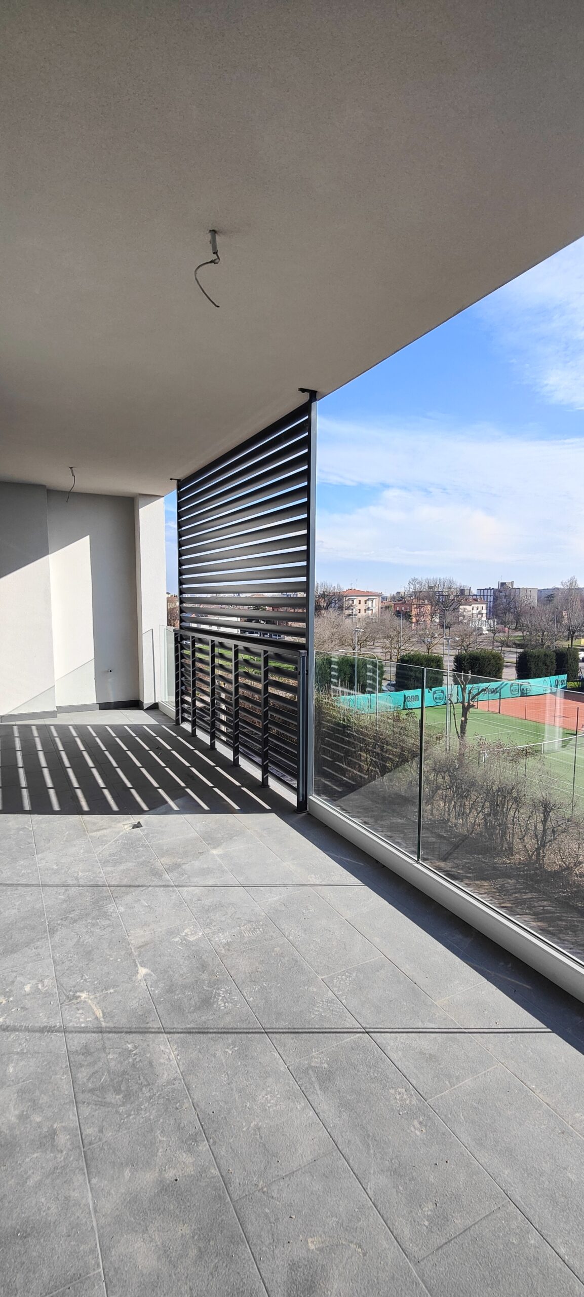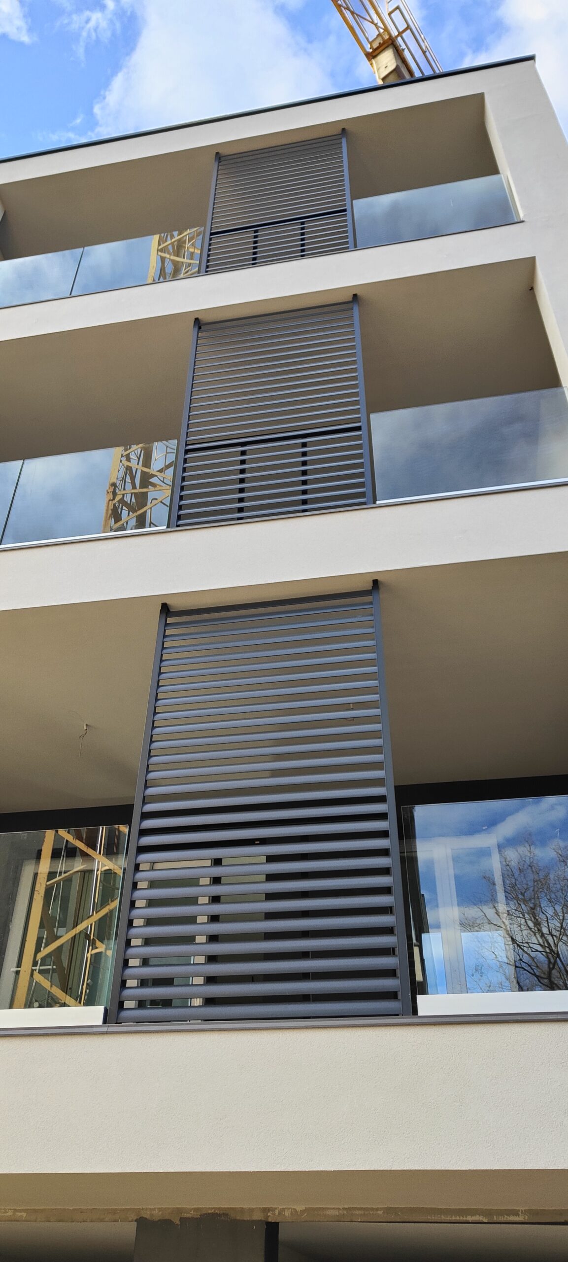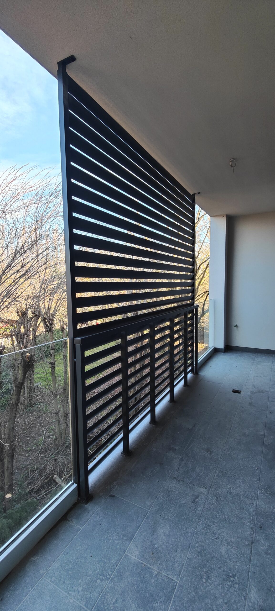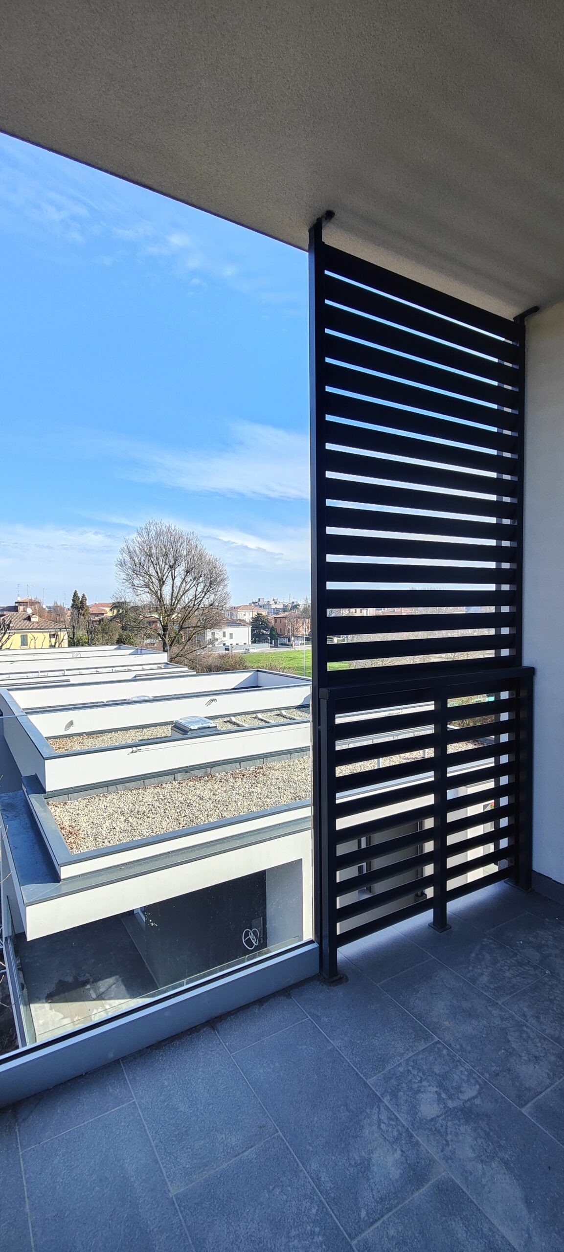 Frangisole modello ALL FIX SCATOLARE, a schermo fisso, costituito da montanti in tubolare di alluminio e pannello in profili scatolari orizzontali o verticali in alluminio sezione rettangolare.
