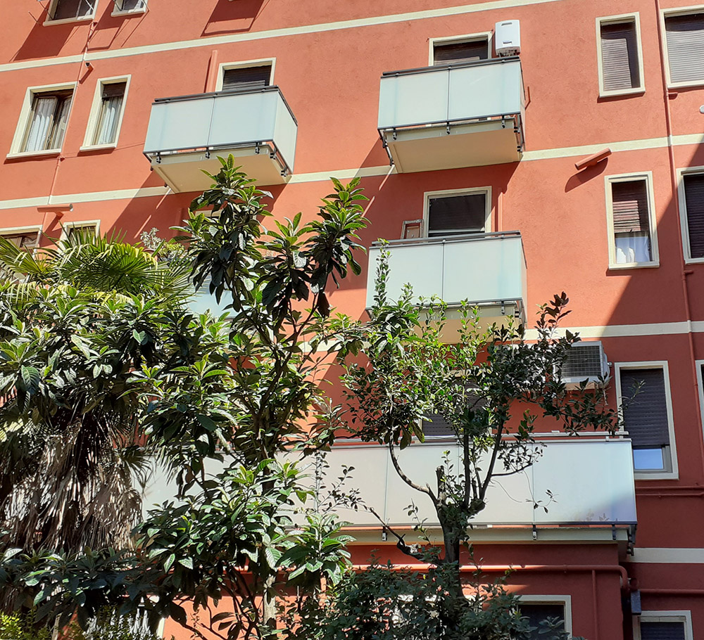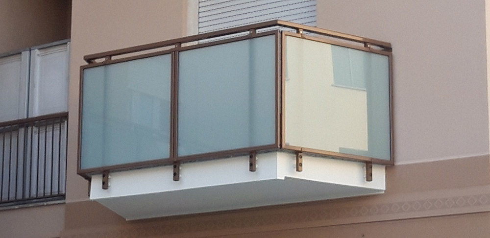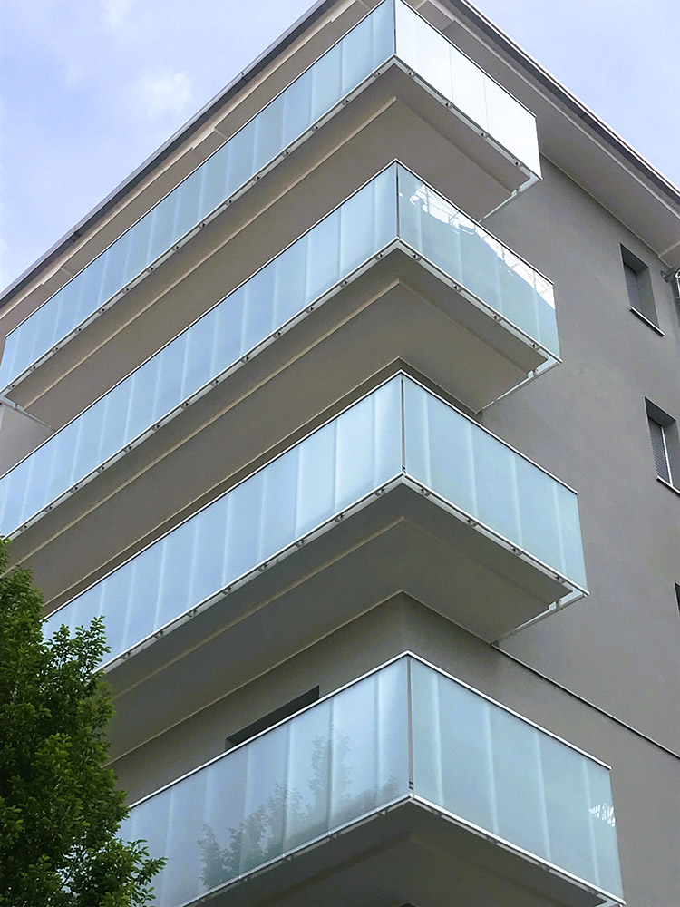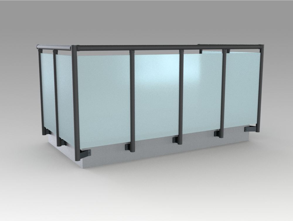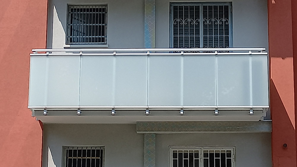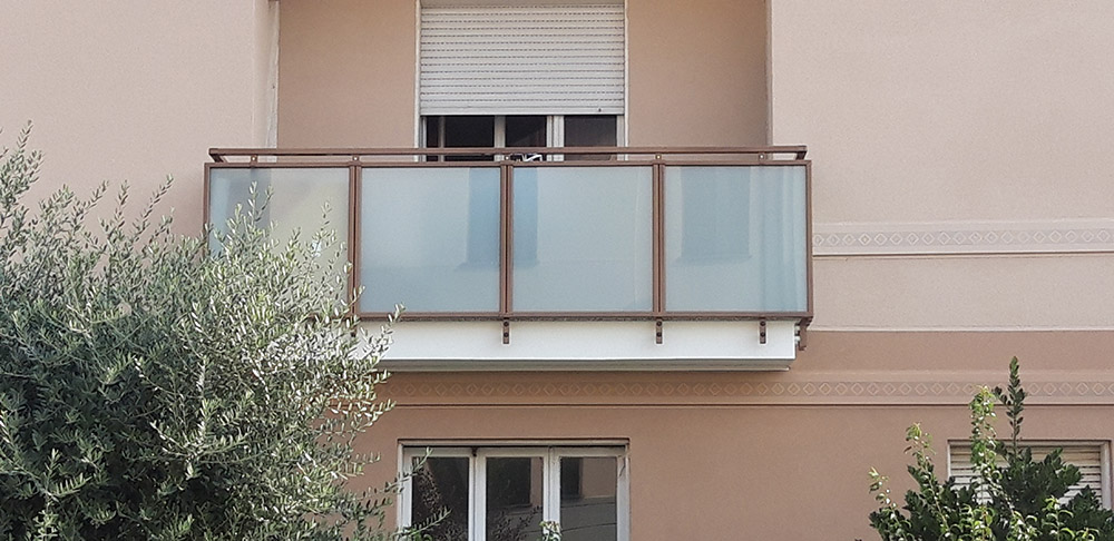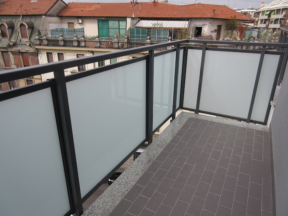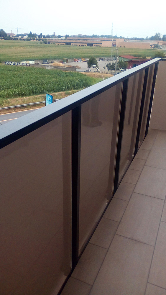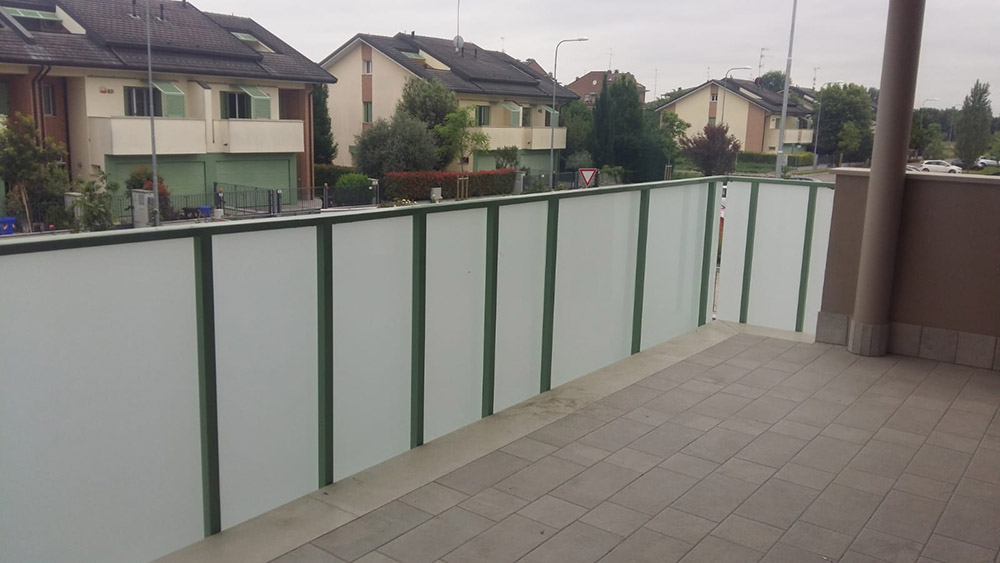 Parapetto modello ALL LUX 60 costituito da montanti verticali in profilato estruso di alluminio a sez. cilindrica, all’occorrenza internamente rinforzato con profilo in alluminio a disegno, completi di sede interna per l’alloggiamento della lastra in vetro e guarnizione di tenuta. Pannello di completamento in vetro. Colori a scelta da mazzetta RAL.