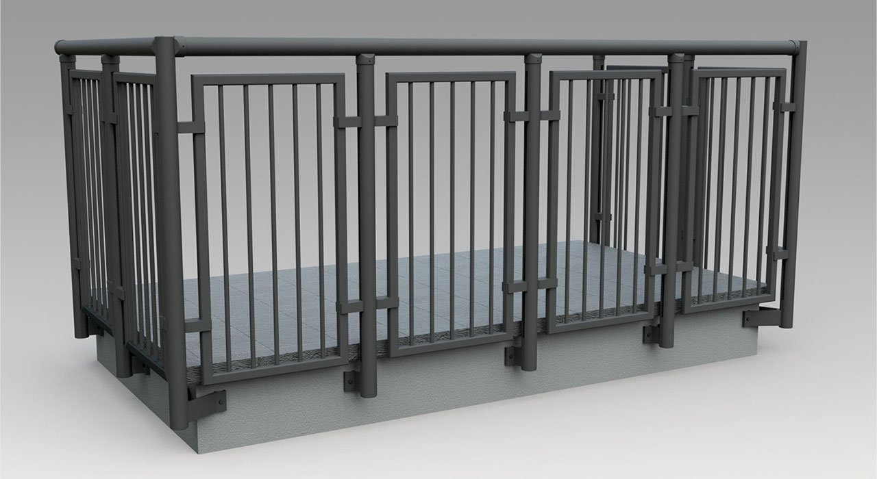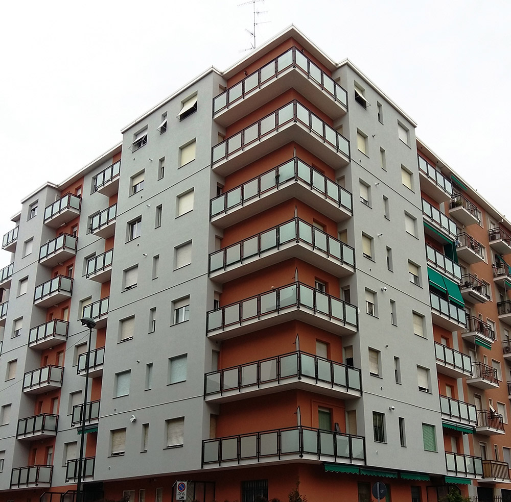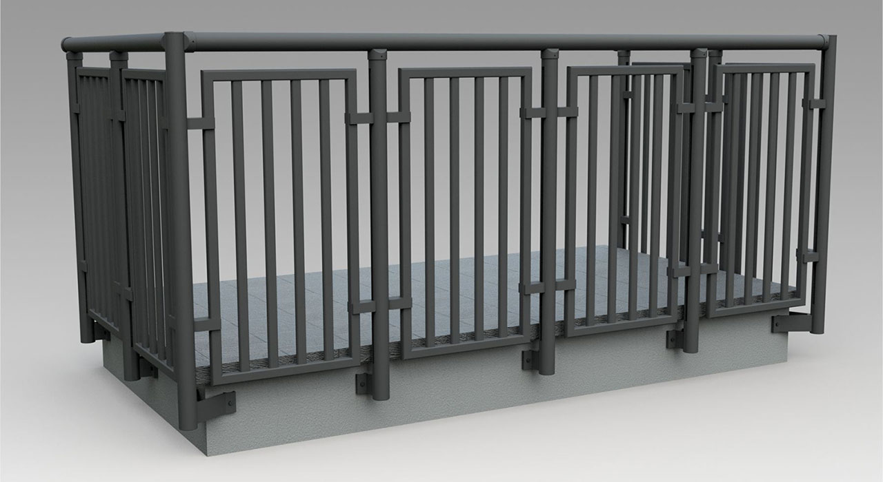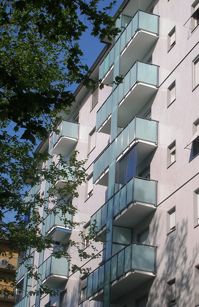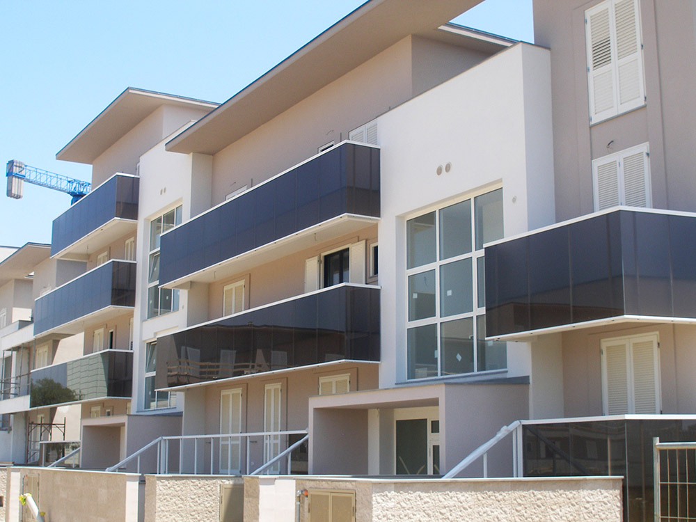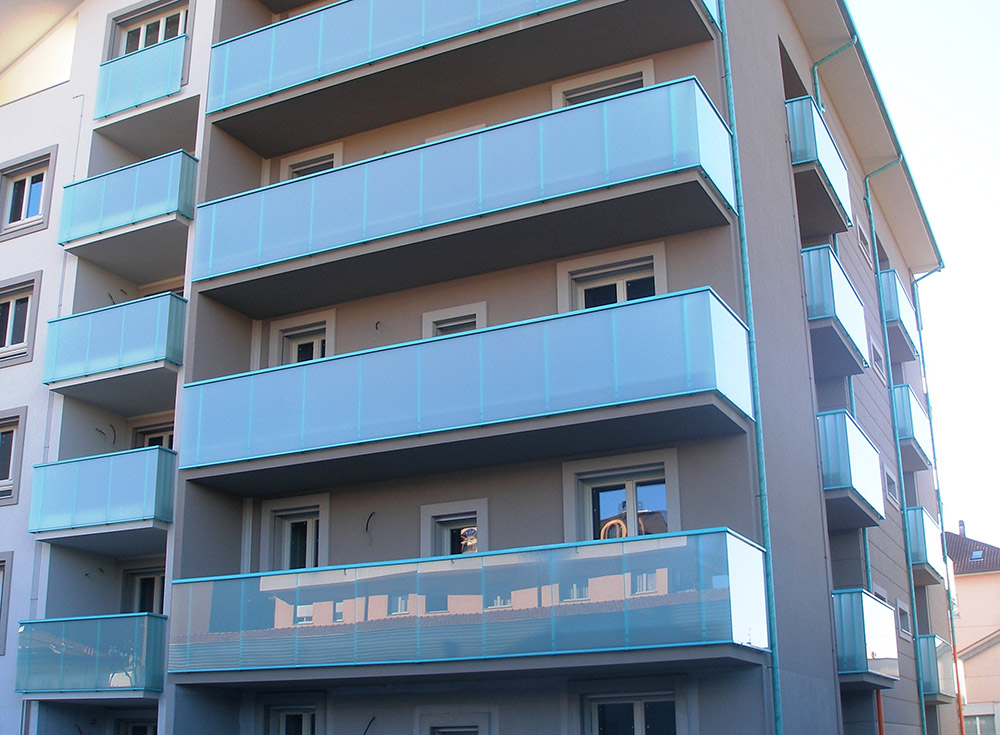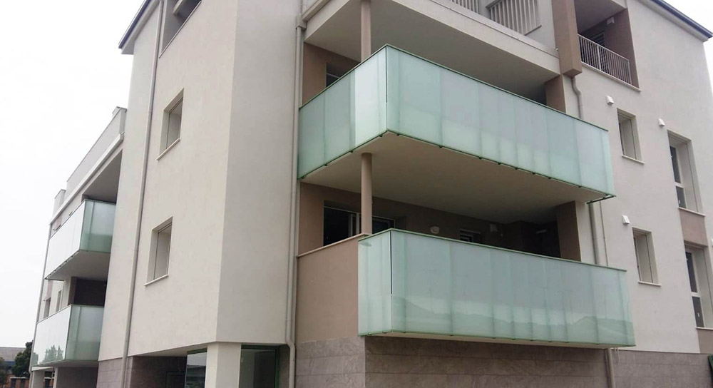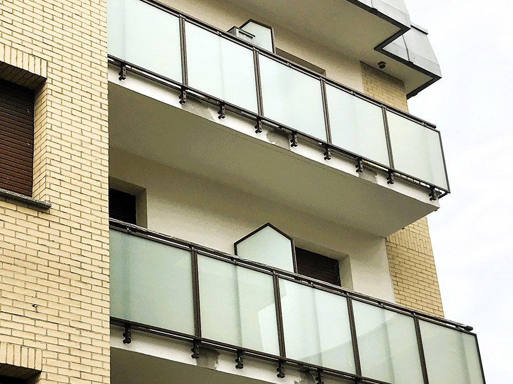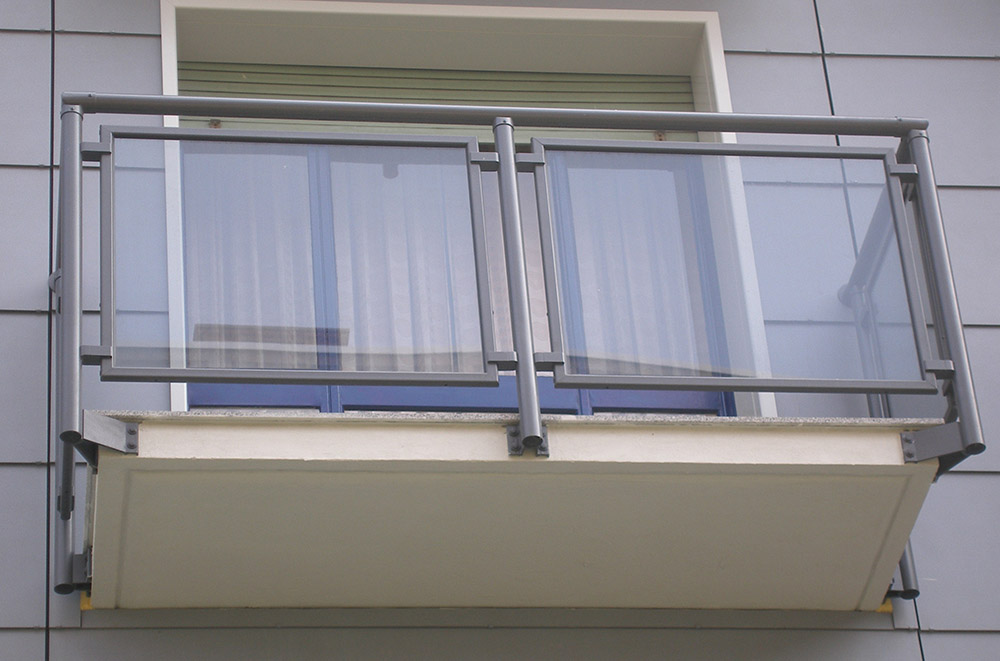 Parapetto modello ALL LUX 60 costituito da montanti verticali in profilato estruso di alluminio a sez. cilindrica, all’occorrenza internamente rinforzato con profilo in alluminio a disegno, completi di sede interna per l’alloggiamento della lastra in vetro e guarnizione di tenuta. Pannello di completamento in vetro. Colori a scelta da mazzetta RAL.
