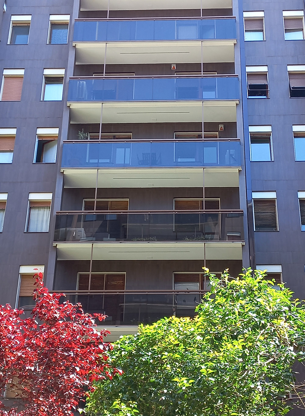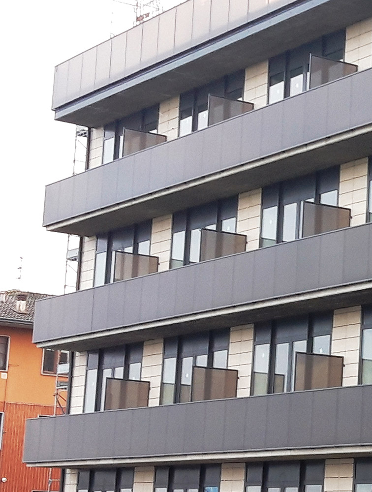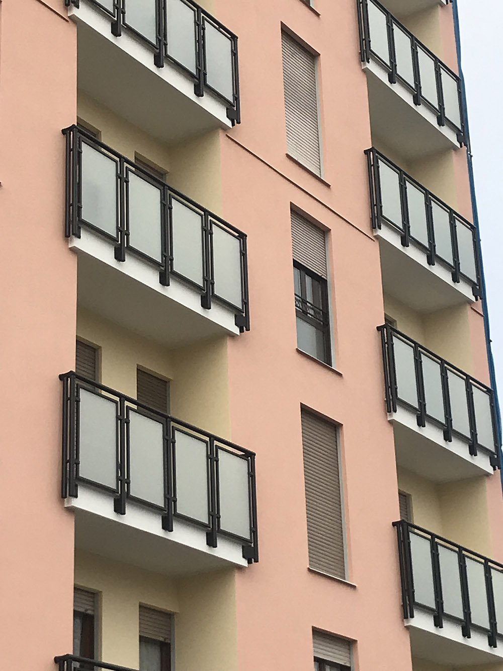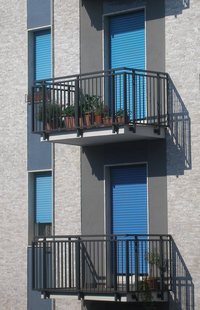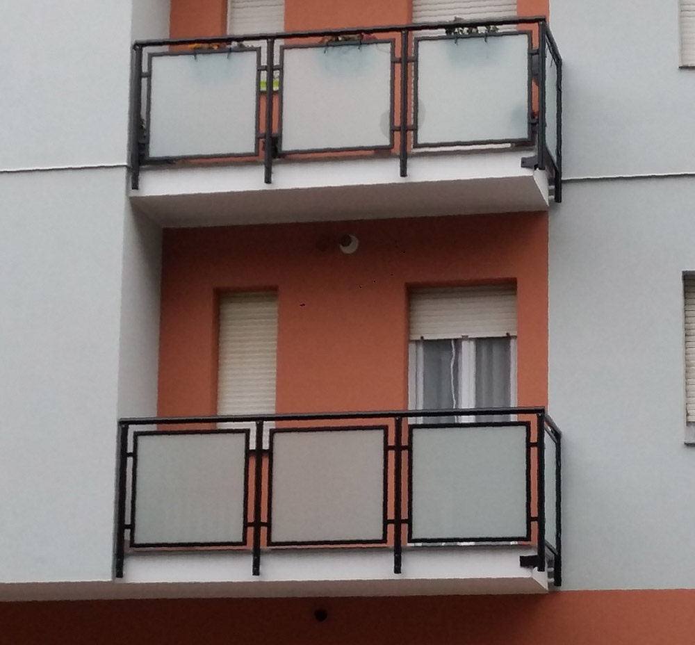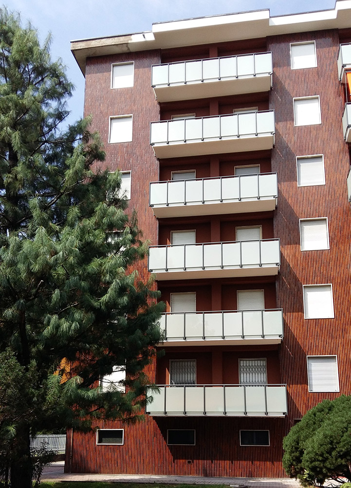 Pannello di completamento costituito da cornici su 4 lati, in profilato di alluminio verniciate RAL e tamponamento in vetro o a bacchette verticali di alluminio. Colori a scelta da mazzetta RAL.