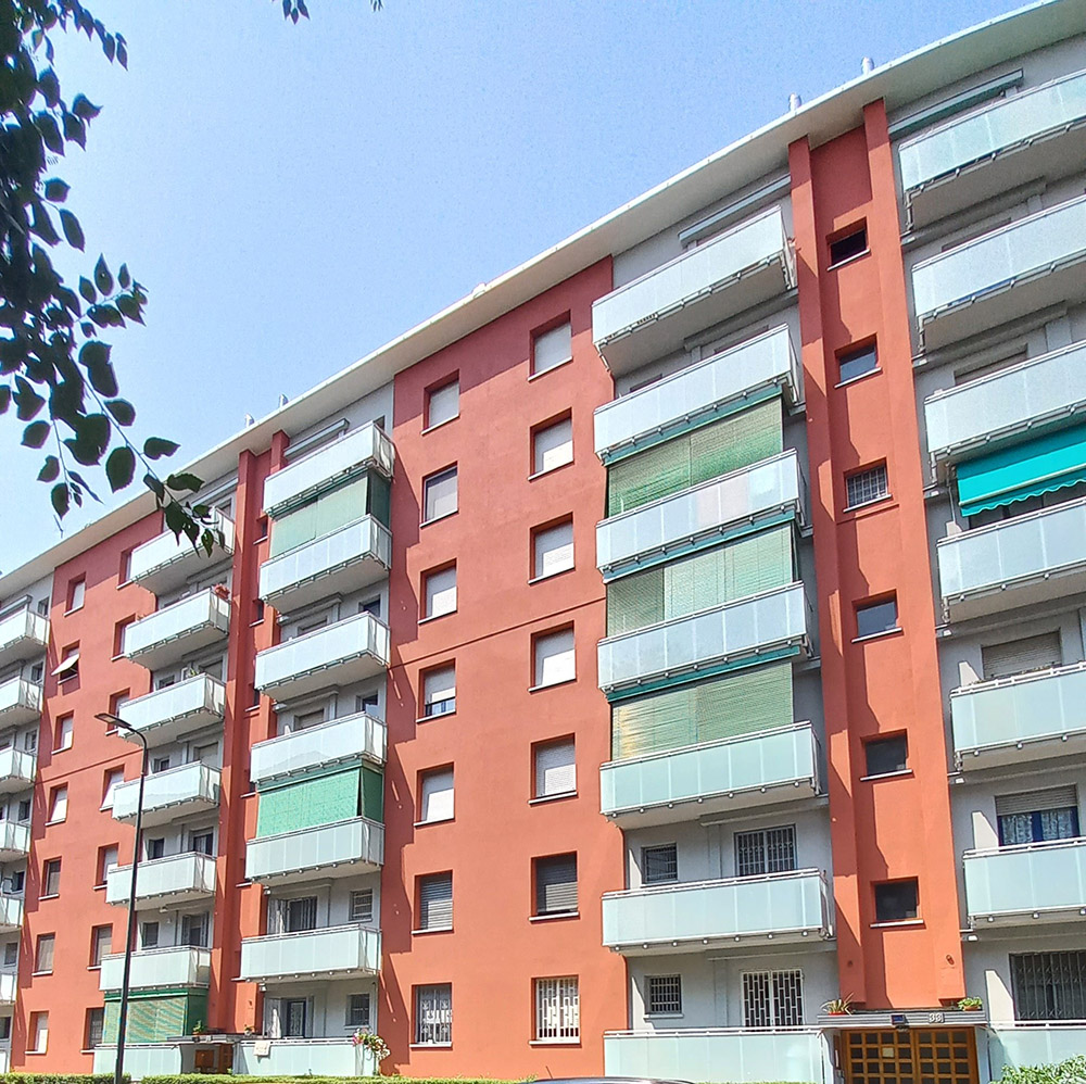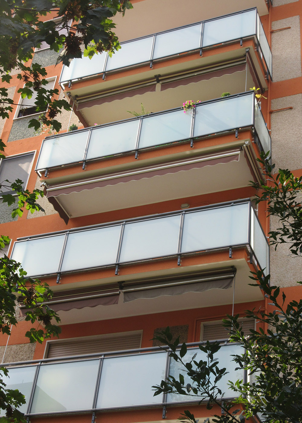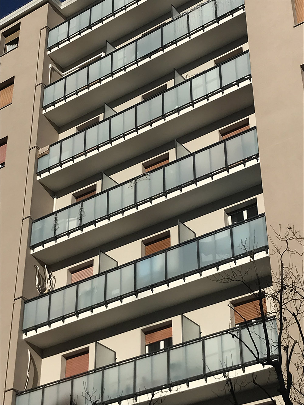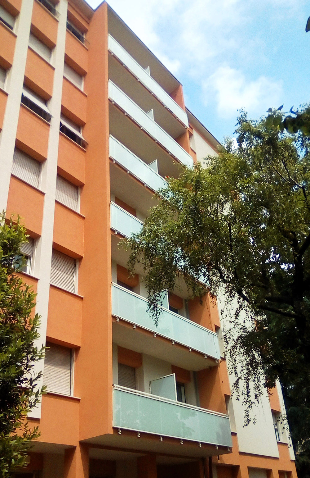 Pannello di completamento costituito da cornici su 4 lati, in profilato di alluminio verniciate RAL e tamponamento in vetro o a bacchette verticali di alluminio. Colori a scelta da mazzetta RAL.