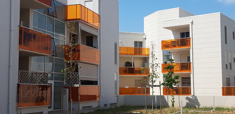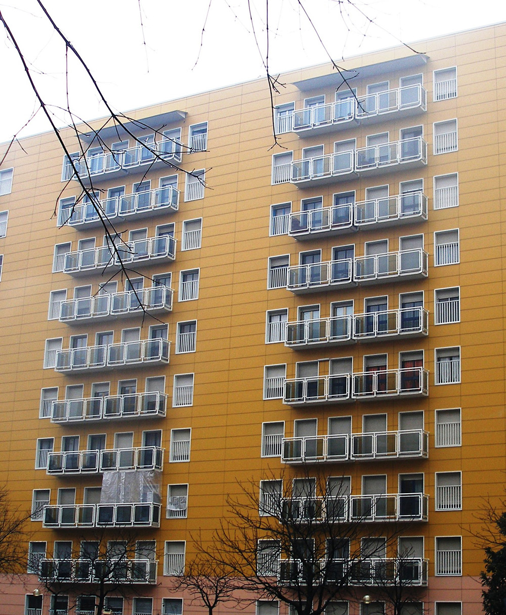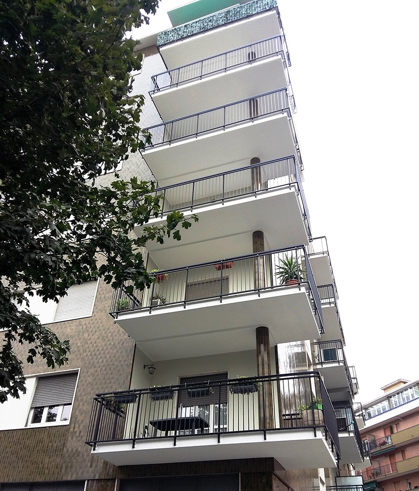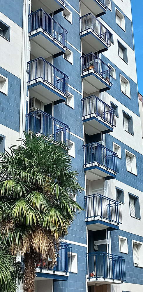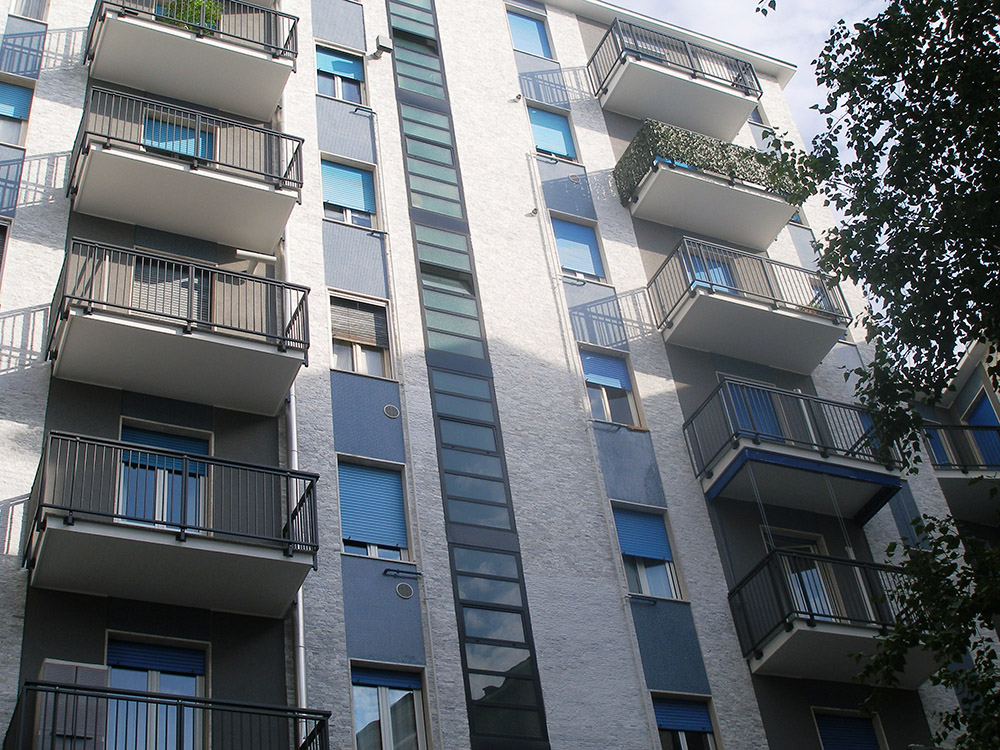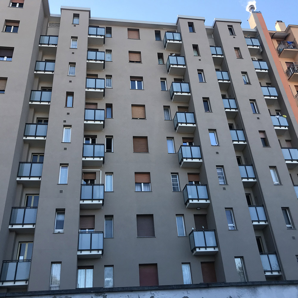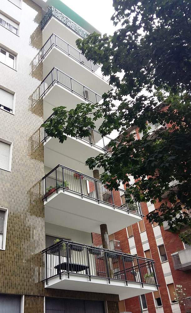 Pannello di completamento costituito da cornici su 4 lati, in profilato di alluminio verniciate RAL e tamponamento in vetro o a bacchette verticali di alluminio. Colori a scelta da mazzetta RAL.