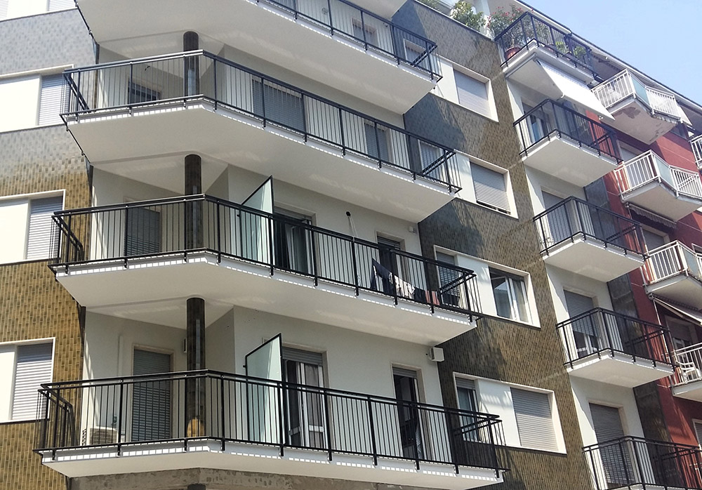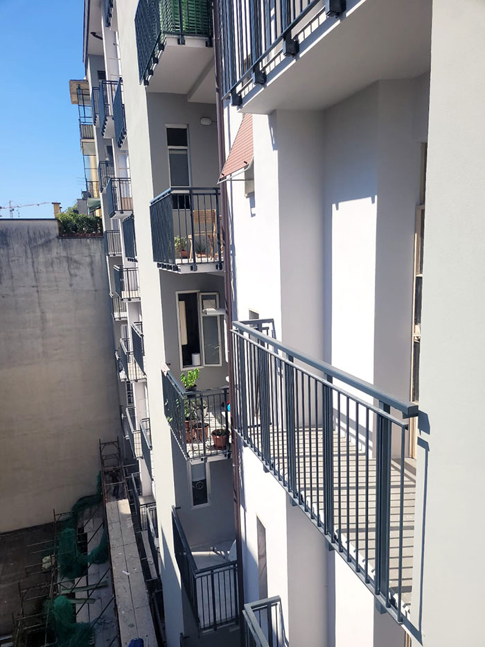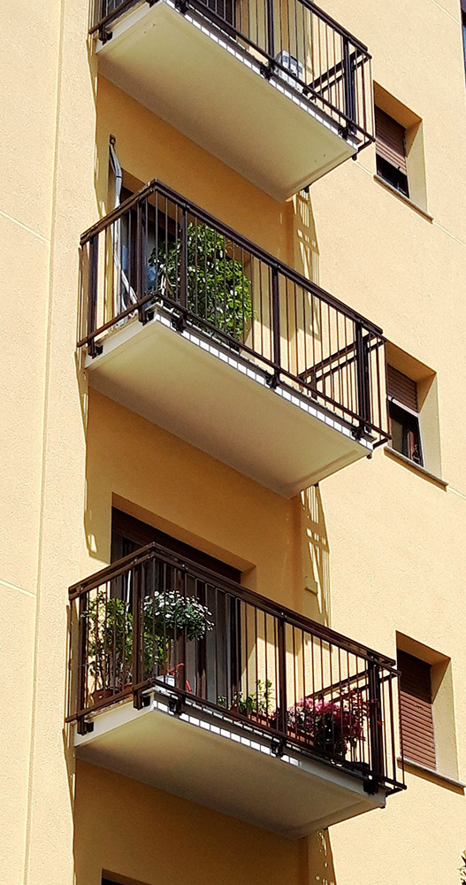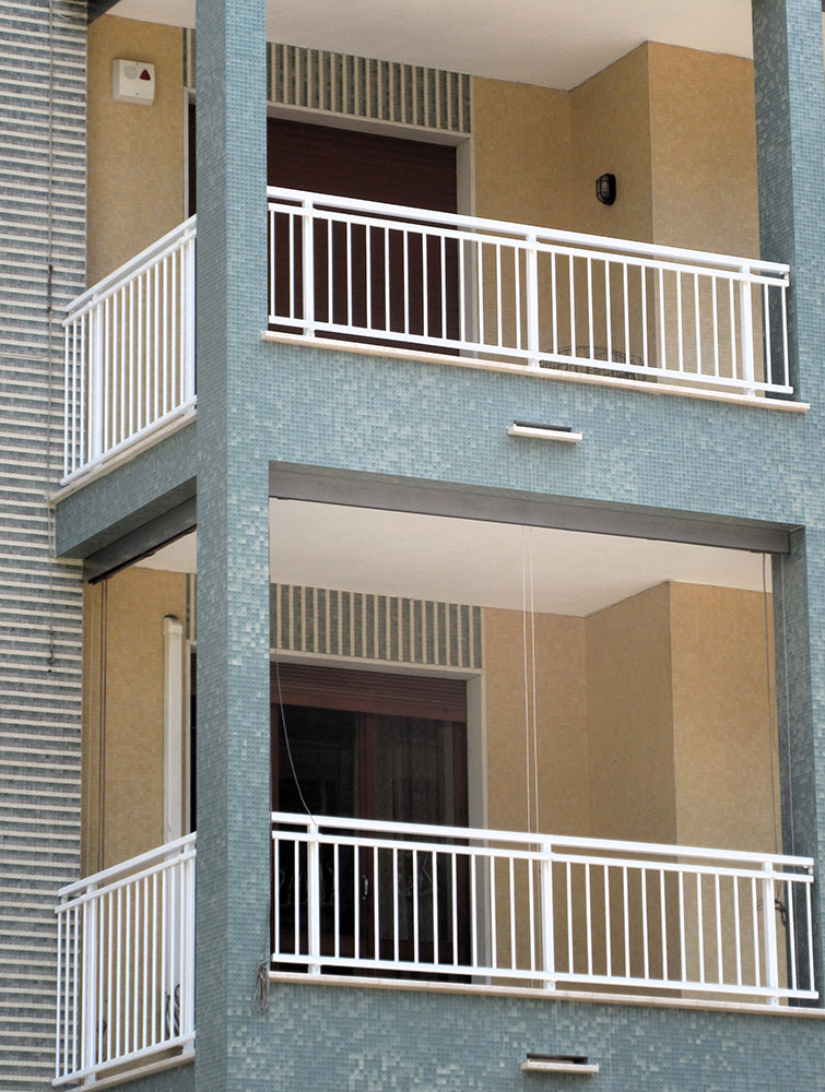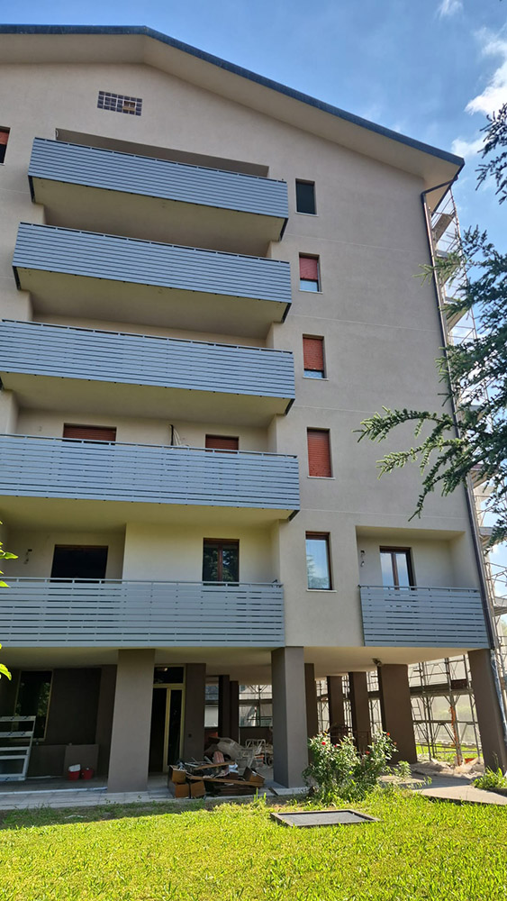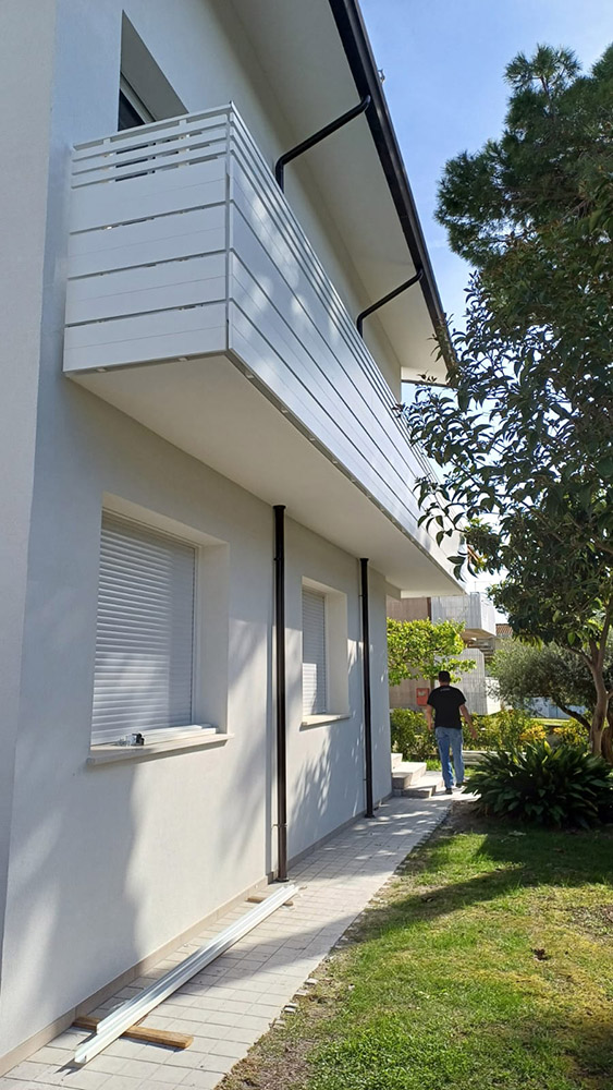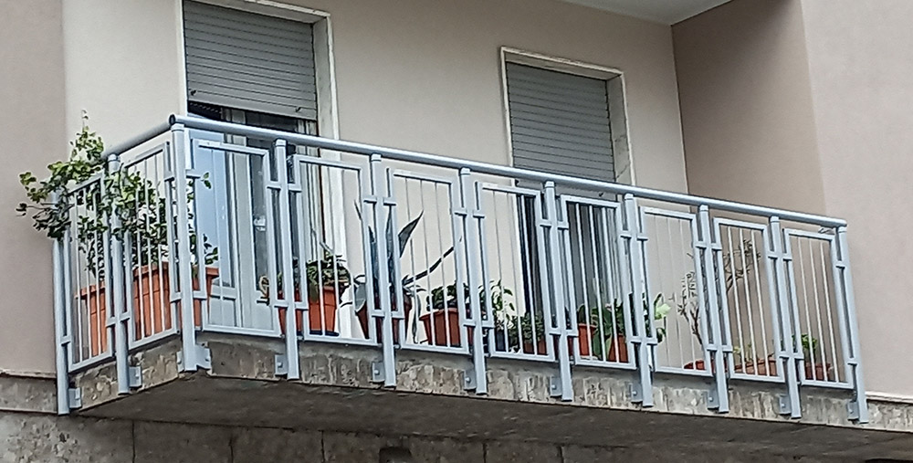 Parapetto modello DOGAL costituito da montanti in tubolare esterno di alluminio, internamente rinforzati in acciaio e corrimano a sezione rettangolare