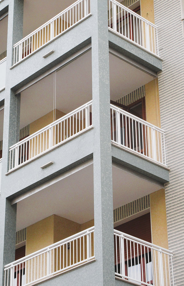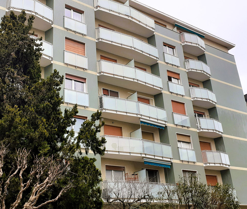 Parapetto modello ALL B GLASS – ALL B MIX costituito da montanti in tubolare esterno di alluminio, internamente rinforzati in acciaio e corrimano a sezione rettangolare.