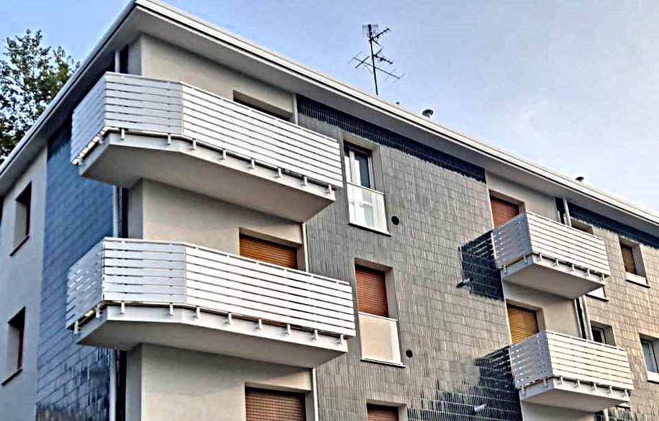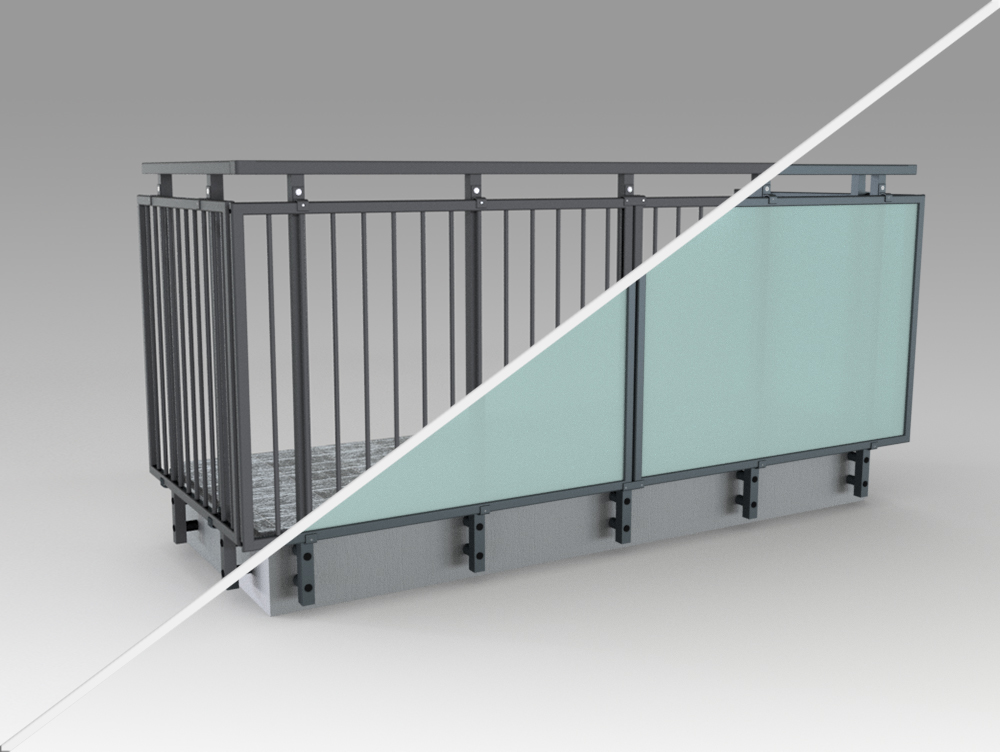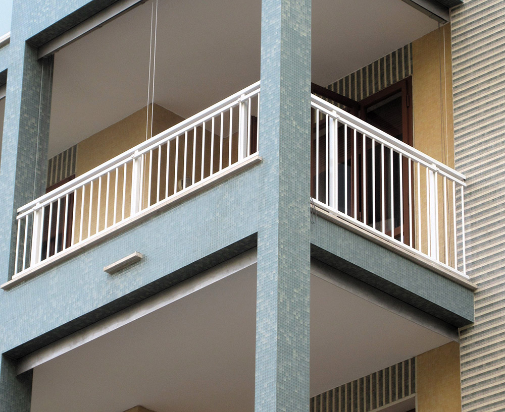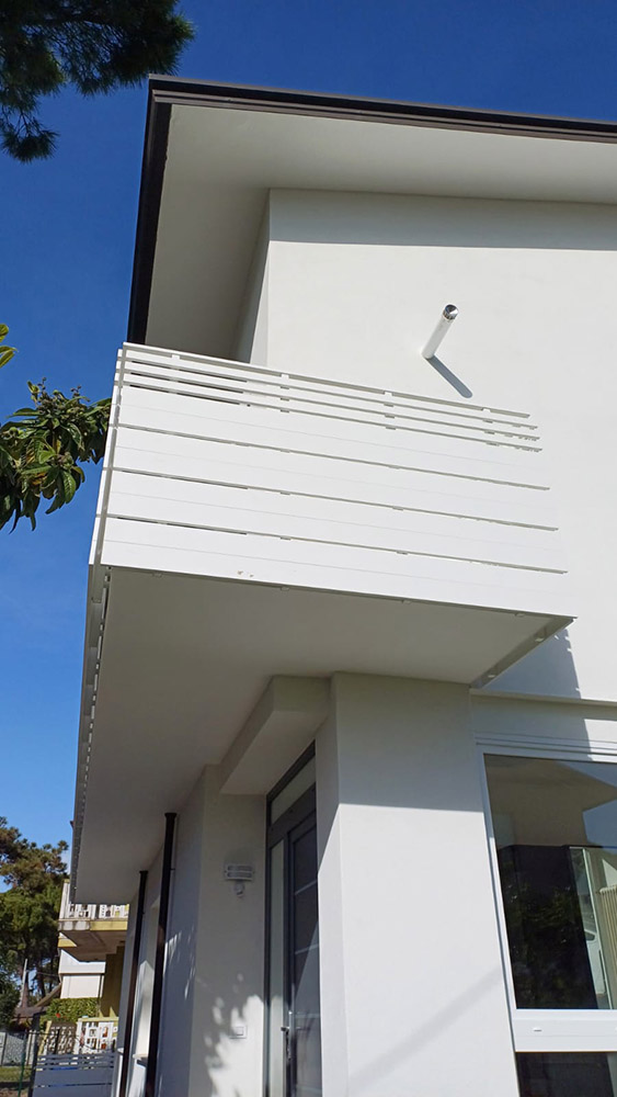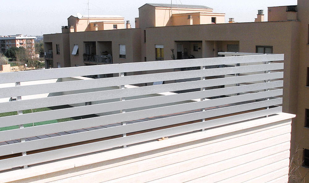 Parapetto modello ALL LUX – ALL MIX costituito da montanti in tubolare esterno di alluminio, internamente rinforzati in acciaio e corrimano a sezione rettangolare.