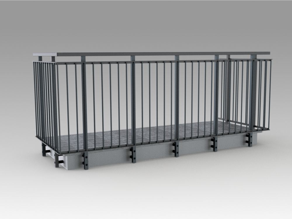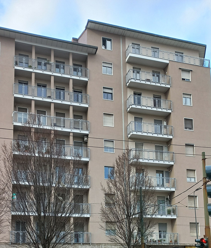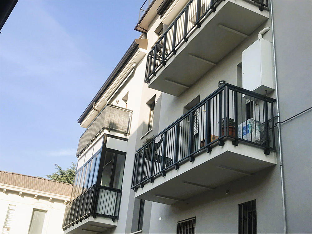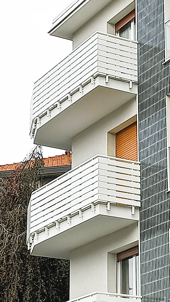Parapetto modello ALL LUX – ALL MIX costituito da montanti in tubolare esterno di alluminio, internamente rinforzati in acciaio e corrimano a sezione rettangolare.