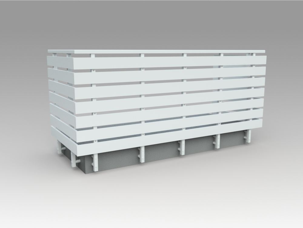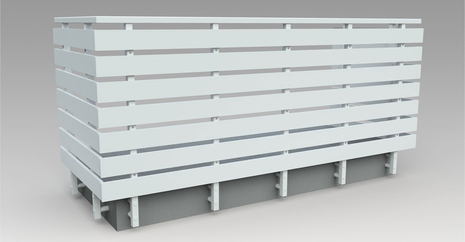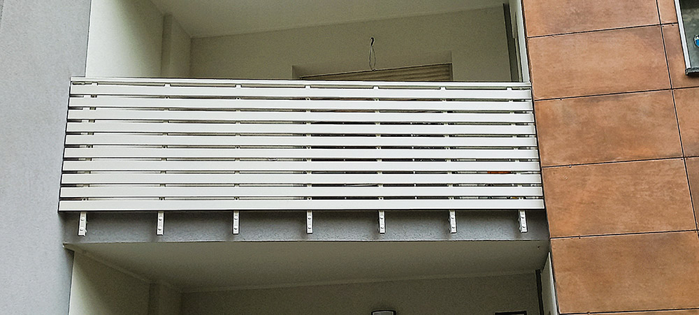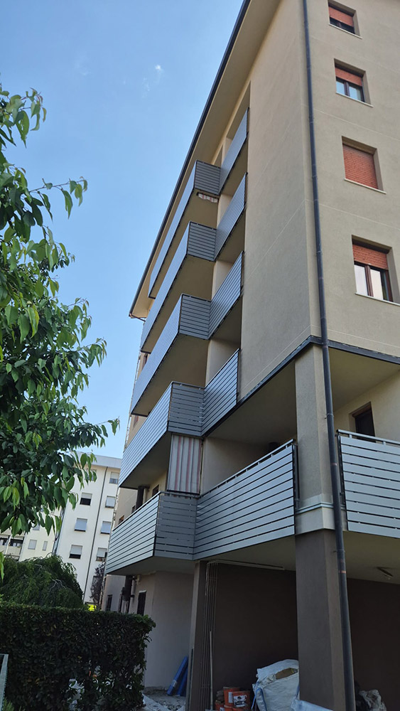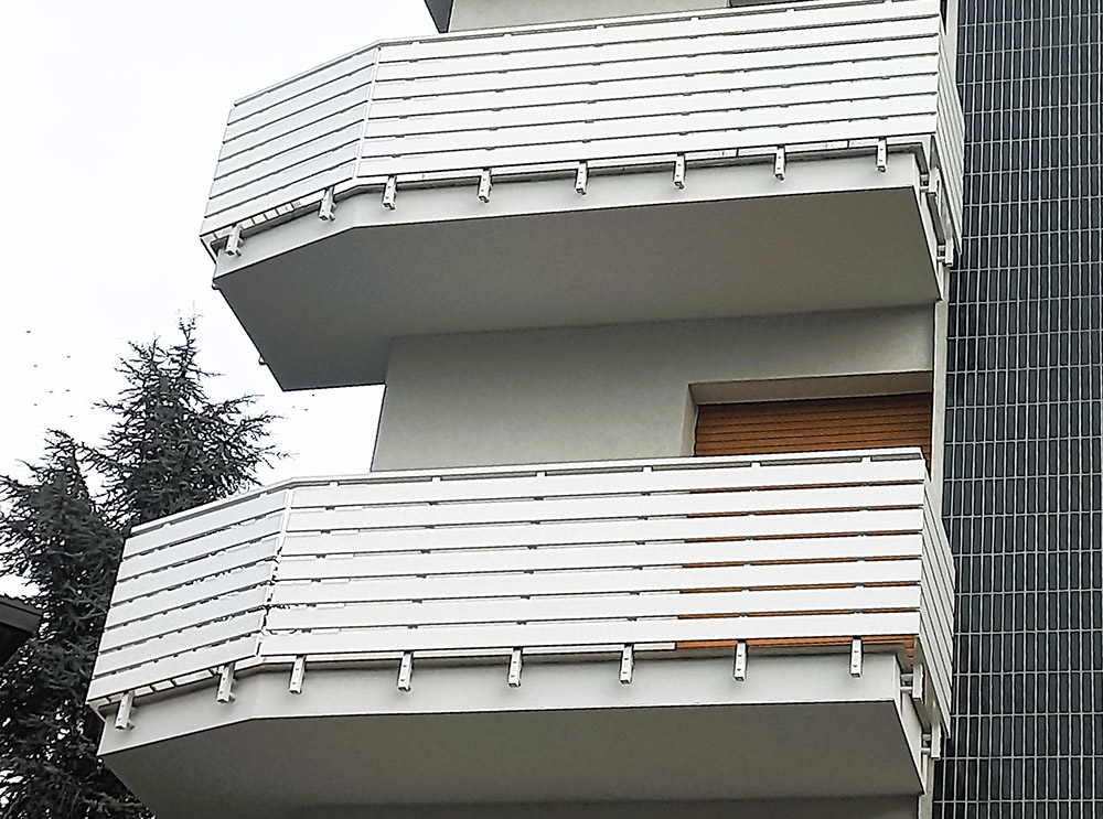 Pannello di completamento costituito da doghe orizzontali in profilato di alluminio sezione rettangolare fissate a barra piatta. Colori a scelta da mazzetta RAL.