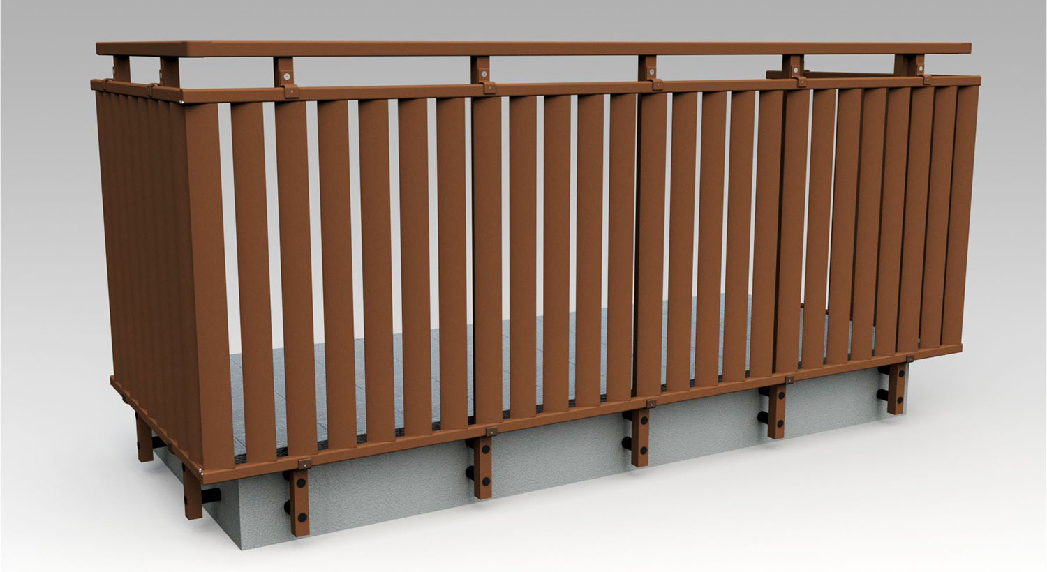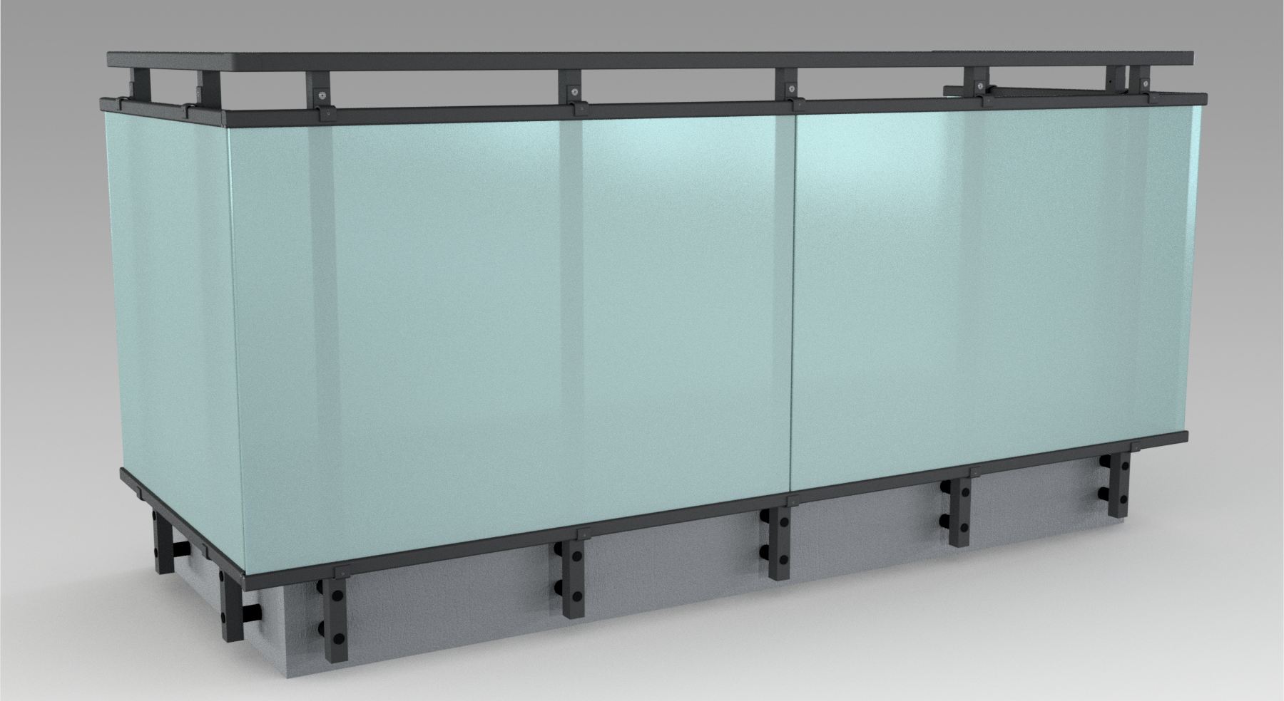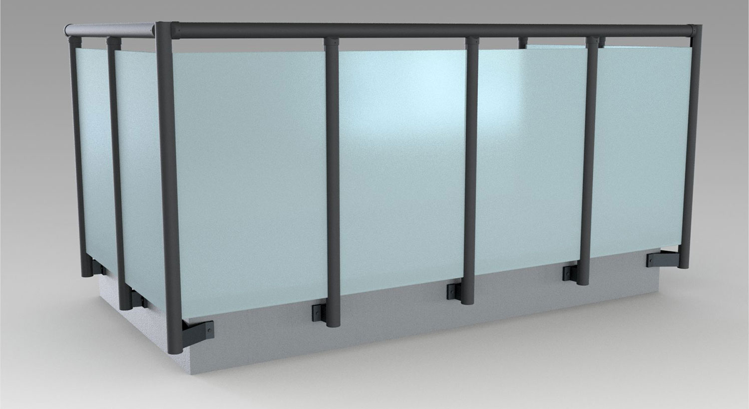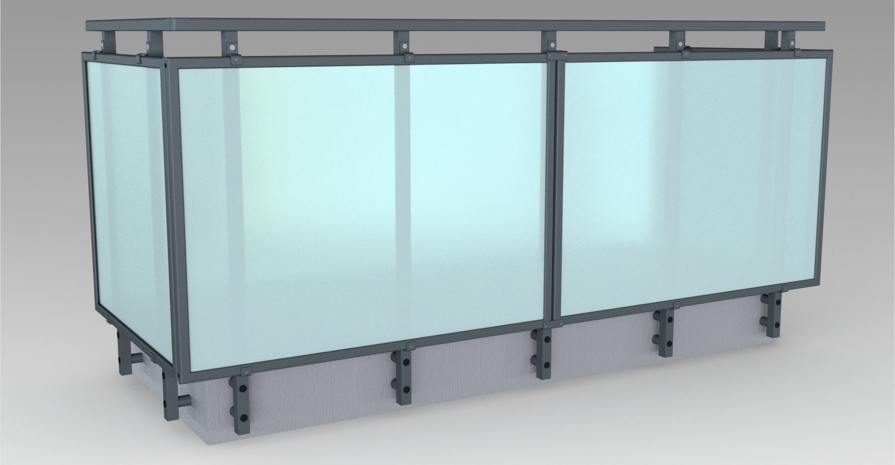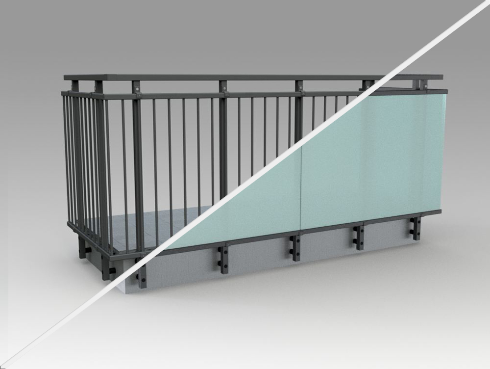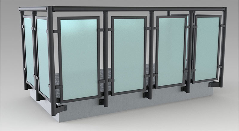 Pannello di completamento costituito da cornice inferiore in profilato di alluminio verniciato RAL e tamponamento in vetro o a bacchette verticali di alluminio. Colori a scelta da mazzetta RAL.