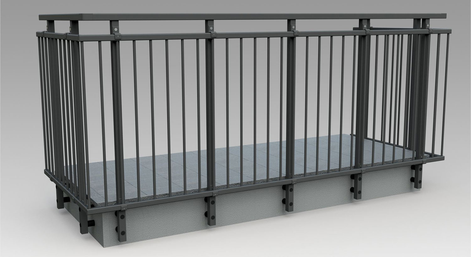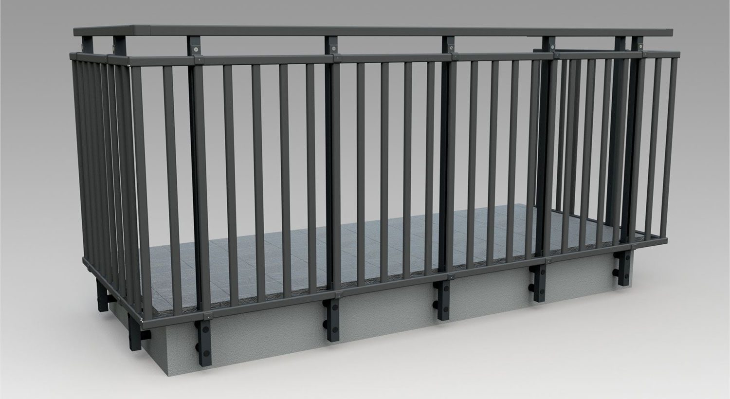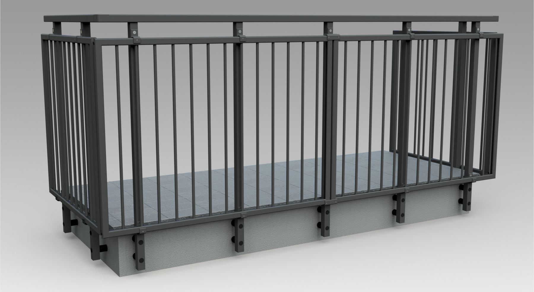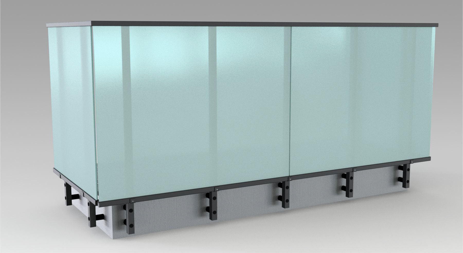 Pannello di completamento costituito da cornice inferiore in profilato di alluminio verniciato RAL e tamponamento in vetro o a bacchette verticali di alluminio. Colori a scelta da mazzetta RAL.