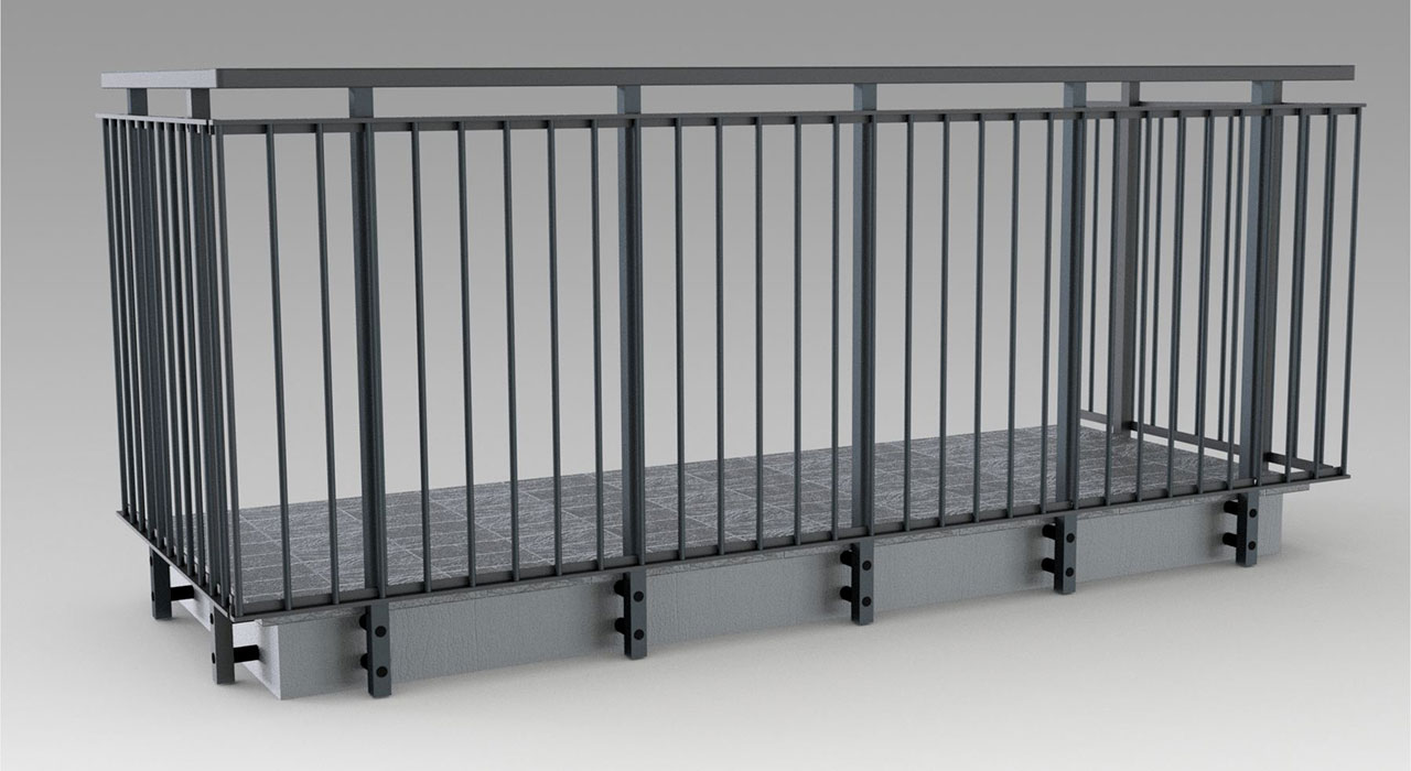 Parapetto modello CIMONE costituito da montanti in tubolare esterno di alluminio, internamente rinforzati in acciaio e corrimano a sezione rettangolare.