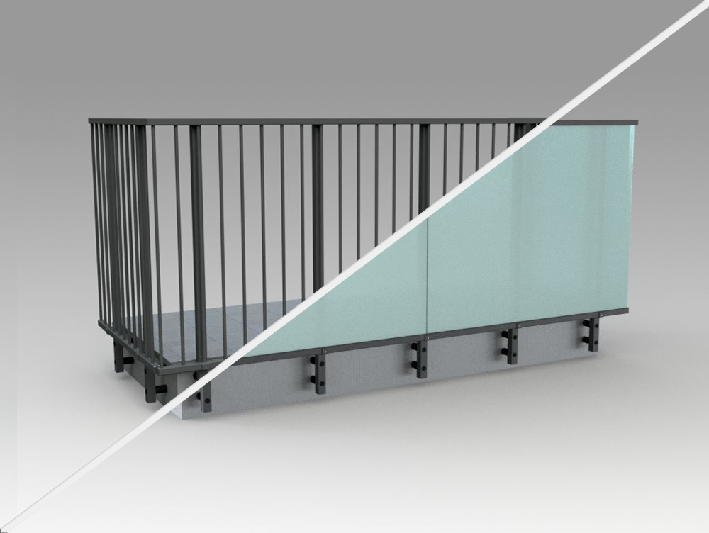 Parapetto modello ALL GLASS 40 – ALL MIX 40 costituito da montanti in tubolare esterno di alluminio, internamente rinforzati in acciaio e corrimano a sezione rettangolare.
